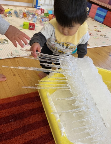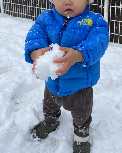 0歳児クラスはほぼ初めて触る雪に興味津々♪